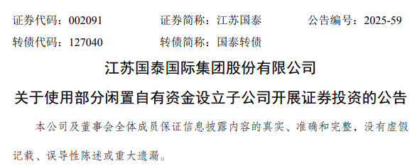 2023年8月25日,江苏国泰董事会审议通过议案,同意公司及合并报表范围内子公司使用闲置自有资金开展证券投资,投资总额不超过10亿元(含)。