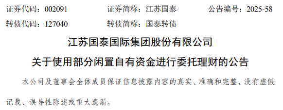 2024年8月24日,江苏国泰公告称,公司及下属子公司拟使用不超过115亿元(含115亿元)的闲置自有资金进行委托理财。