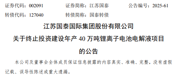 值得注意的是,江苏国泰宣布终止总投资15.38亿元的年产40万吨锂离子电池电解液项目。