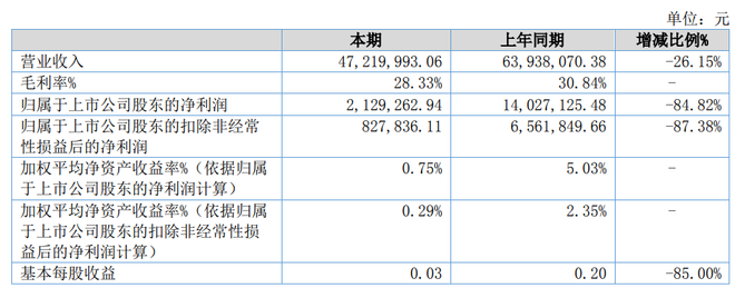 8月22日晚间,北交所公司西磁科技(836961)公布2025年半年报,公司营业收入为4722万元,同比下降26.15%;归母净利润为213万元,同比下降84.82%;扣非归母净利润为83万元,同比下降87.38%。