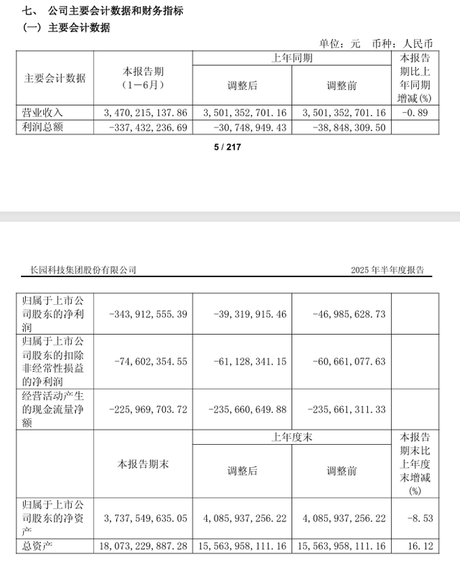 8月25日,ST长园(600525)公布2025年半年报,公司营业收入为34.7亿元,同比下降0.9%;归母净利润自去年同期亏损4699万元变为亏损3.44亿元,亏损额进一步扩大;扣非归母净利润自去年同期亏损6066万元变为亏损7460万元,亏损额进一步扩大;经营现金流净额为-2.26亿元,同比增长4.1%;EPS(全面摊薄)为-0.2608元。