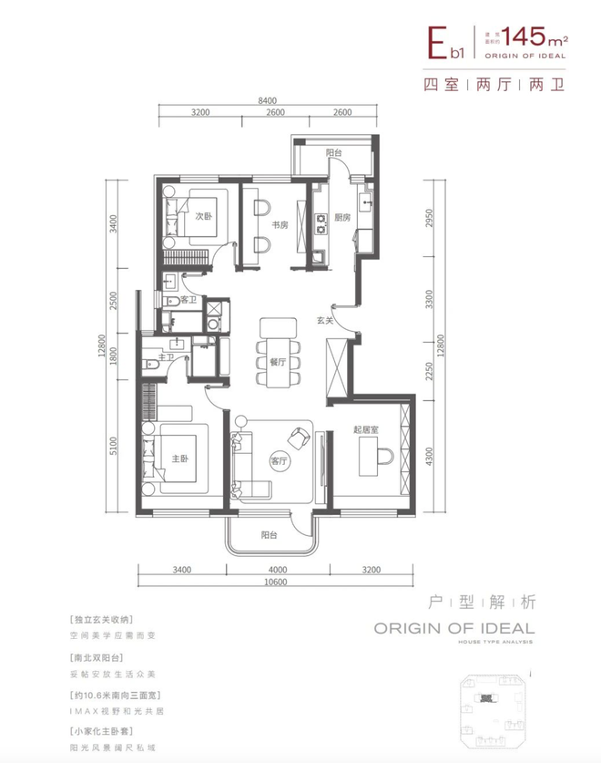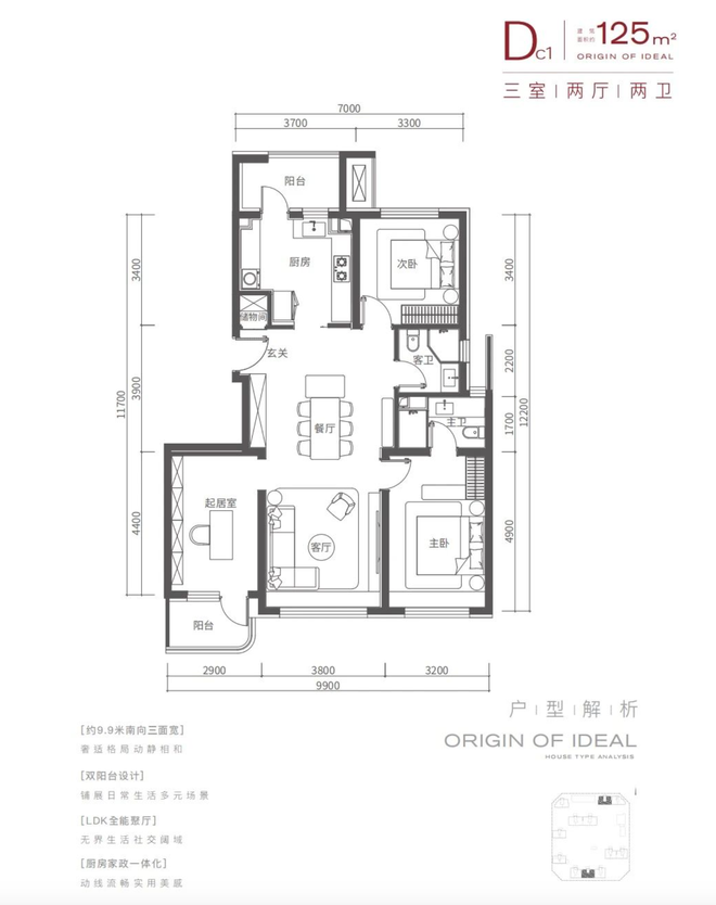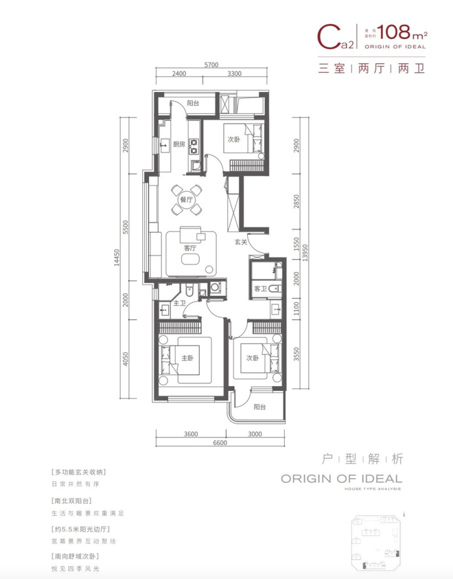 起步108三室两厅两卫户型,5.5米阳光边厅,南向双套房设计。