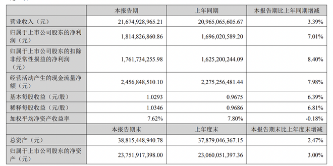 其中第二季度公司合计实现营业收入109.39亿元,同比增长3.65%;实现归属于上市公司股东的净利润9.00亿元,同比增长7.98%;实现归属于上市公司股东的扣除非经常性损益的净利润8.64亿元,同比增长9.85%。