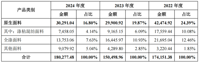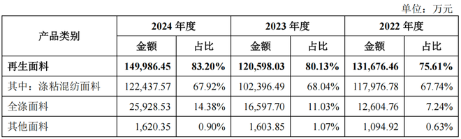 报告期内,福恩股份的收入中,约99%来自主营业务,其中再生面料为核心产品,业绩贡献占主营业务比分别为75.61%、80.13%、83.20%;原生面料分别为24.39%、19.87%、16.8%。