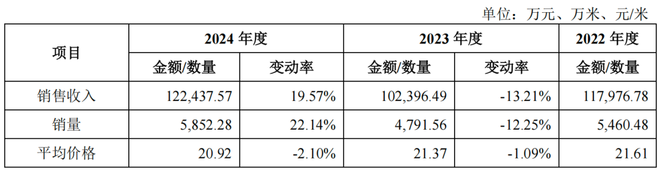 而影响到福恩股份利润表现的还有其产品售价,最核心产品再生面料中,涤粘混纺面料、全涤面料的销售单价期内均有所下滑。其中业绩占比六成以上的再生涤粘混纺面料单价,报告期内分别为21.61元/米、21.37元/米、20.92元/米;2023年下滑1.09%,2024年再下滑2.1%;但销量先降后升,期内分别为5460.48万米、4791.56万米、5852.28万米,2024年同比上涨22.14%。