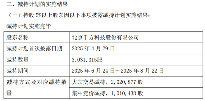 8月24日晚间,鸿泉物联(688288)公告,近日,公司收到股东千方科技的书面通知,截至2025年8月22日,千方科技通过集中竞价交易方式合计减持公司股份1,010,438股,通过大宗交易方式合计减持公司股份2,020,877股,总计减持公司股份3,031,315股,占公司当前总股本的3.00%,本次减持计划完成。