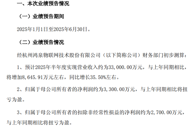 7月21日晚间,鸿泉物联(688288)发布2025年半年度业绩预告,公司预计2025年半年度实现营业收入约为3.3亿元,与上年同期相比,将增加8646万元左右,同比增长35.50%左右。归母净利润约为3300万元,与上年同期的-1822万元相比,将扭亏为盈。同时,归母净利润扣除非经常性损益后预计约为2700万元,亦将扭亏为盈,去年同期为-2039万元。