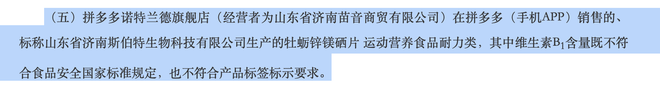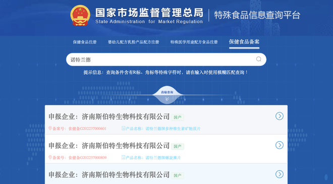 今年5月,国家市场监管总局在其官方网站发布了38批次食品抽检不合格情况的通报,其中“诺特兰德”的生产工厂赫然在册。根据通报,诺特兰德旗舰店销售的济南斯伯特生物科技有限公司生产的牡蛎锌镁硒片运动营养食品耐力类,其中维生素B1含量既不符合食品安全国家标准规定,也不符合产品标签标示要求。