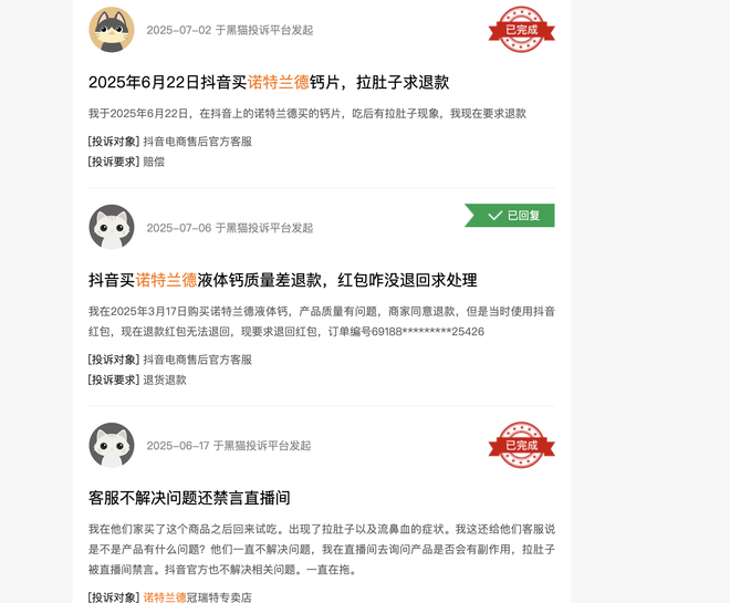 消费者投诉平台黑猫投诉显示,共有291条关于诺特兰德的搜索结果,大多是食品安全问题,虽然不构成该企业的投诉数量,但也说明公司口碑存在一定的问题。