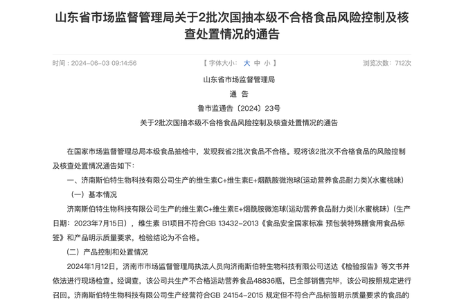 2024年3月份,诺特兰德的工厂济南斯伯特因产品维生素“虚标”含量问题遭到处罚。根据国家市场监督管理总局第20批次食品抽检不合格通告,诺特兰德售卖的维生素C+维生素E+烟酰胺微泡球(运动营养食品耐力类)(水蜜桃味)(生产日期:2023年7月15日),维生素 B1项目不符合GB 13432-2013《食品安全国家标准 预包装特殊膳食用食品标签》和产品明示质量要求,检验结论为不合格。