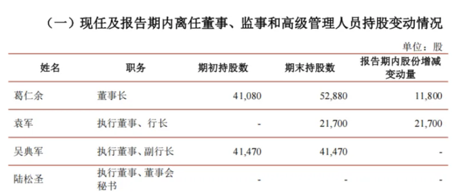 其中,董事长葛仁余增持了1.18万股,增持后持股数为5.28万股,而行长袁军增持了2.17万股、监事长季金松增持了1万股。