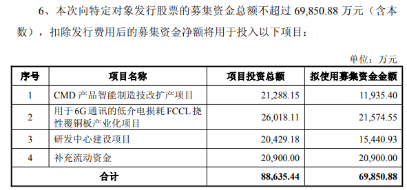 扣除费用后本次募资拟投向4个项目:CMD智能制造技改扩产(1.19亿元)、6G通信用低介电损耗FCCL挠性覆铜板产业化(2.16亿元)、研发中心建设(1.54亿元)及补充流动资金(2.09亿元)。